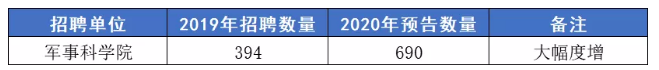 以軍事科學(xué)院為例:2019年招錄文職人員數(shù)據(jù)與2020年文職人員招錄計(jì)劃數(shù)據(jù)對(duì)比分析如下: